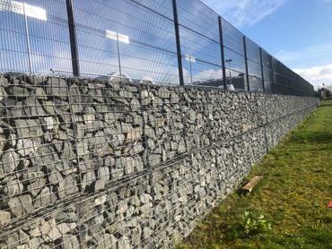Gabion wall with open mesh fencing